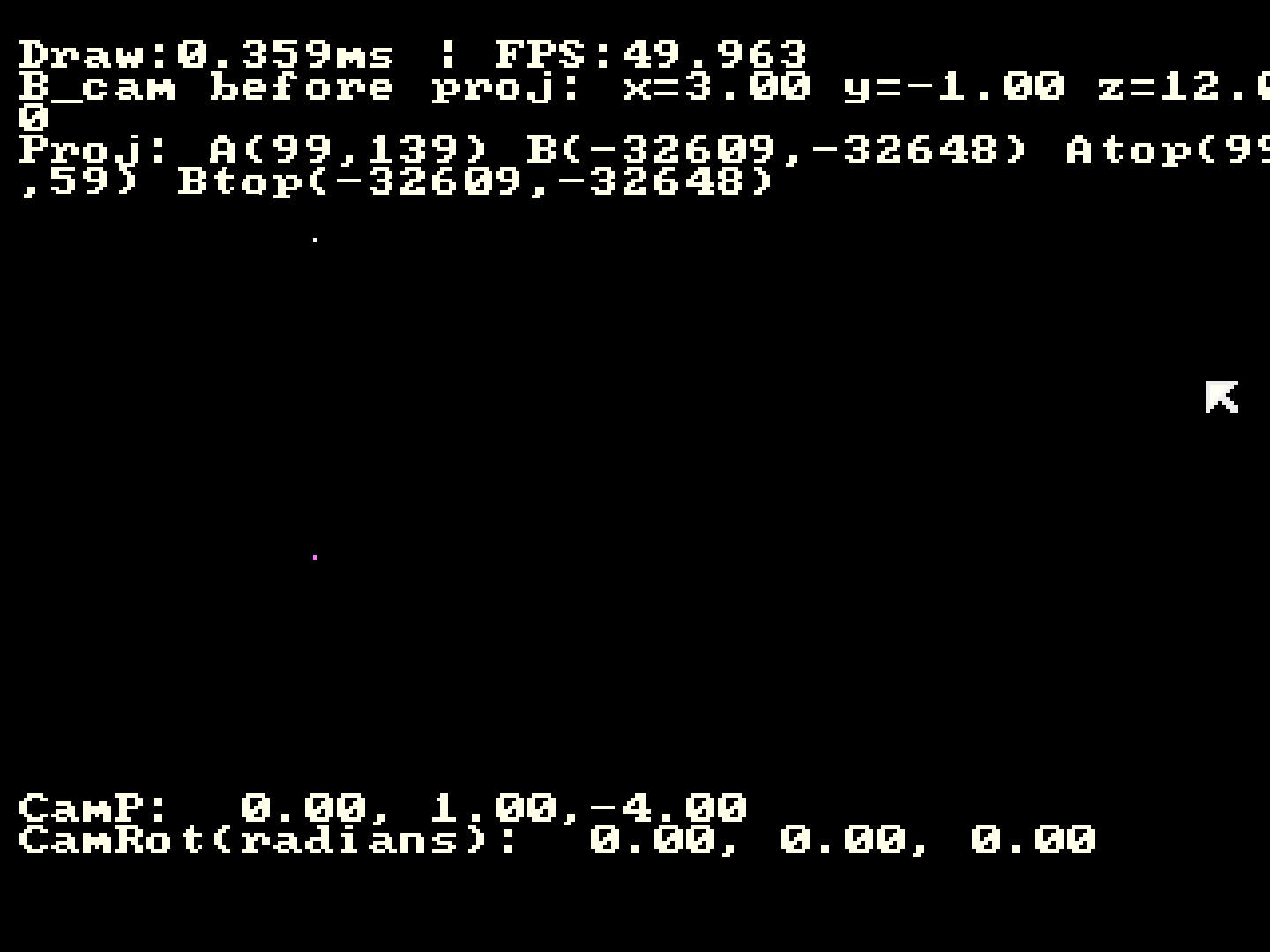 To isolate the problem, I wrote a new fx_div_q16_sat routine — my saturating fixed-point divider — and examined the projection of a simple test wall. Sampling vertex B (the one that consistently produced unstable results) revealed the failure clearly.